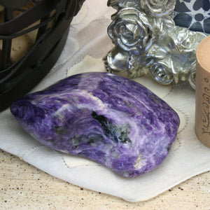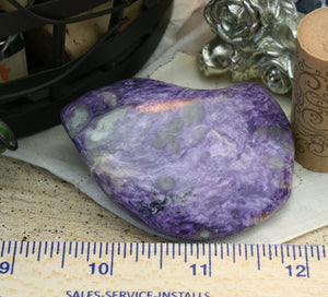 This piece is a free form polished Charoite with matte polished.  It has a bit of Aegirine and Tinkasite growing with the Charoite. The color is rich and the patterning is beautiful and displays a bit of chatoyancy. This piece can be used in any healing modality or displayed in your home or office. It fits well in the hand. Location: Russia. Dimensions: 2.60"x1.85"x0.89". Weight: 81.6 grams. SKU: 20F2296