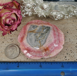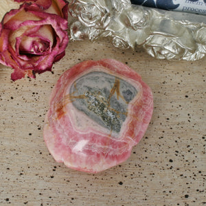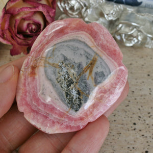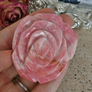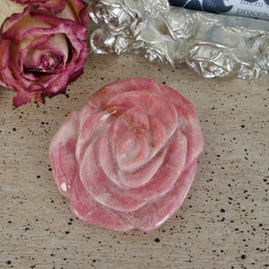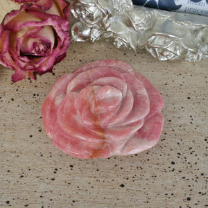 This beauty is a hand carved Rhodochrosite rose carving. The color of the Rhodochrosite shows best in indoor lighting or warm lighting. This piece is a one of a kind. It can be used to display in your home or an office. For those who love unique carvings, this is a special one! This carving can also be used in any healing modality. Location: Capilitas, Argentina. Dimensions: 2.11"1.83"x0.80". Weight: 69.8 grams. SKU: 20J403