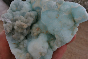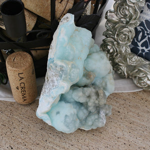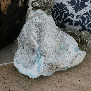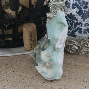 Hemimorphite is a mineral that tends to come in the softer blue shades to almost white and sometimes green. Some pieces, like this beauty, look like floating icebergs! Hemimorphite is often confused with Smithsonite. They are different but both are interestingly enough associated with Calamine. This specimen shimmers softly in direct light. Location: China. Dimensions: 3.55"x3.25"x1.80". Weight: 272.4 grams.