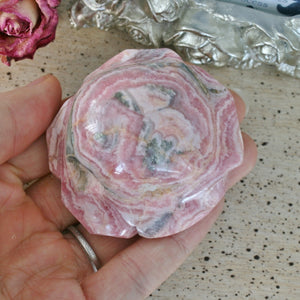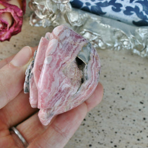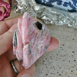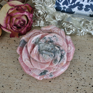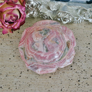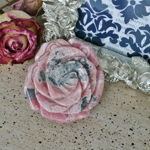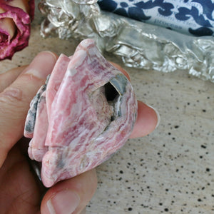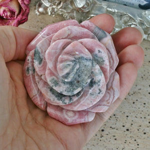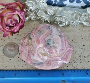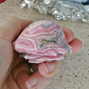 This beauty is a hand carved Rhodochrosite rose carving. The color of the Rhodochrosite shows best in indoor lighting or warm lighting. This piece is a one of a kind. It even has a small "cave" on the side of the rose that you can see into. It has nice deapth to it that feels wonderful in the palm when you hold it. It displays beautifully in your home or an office. For those who love unique carvings, this is a special one! This carving can also be used in any healing modality. Location: Capilitas, Argentina. Dimensions: 2.26"x2.11"x1.46". Weight: 143.3 grams. SKU: 20J529