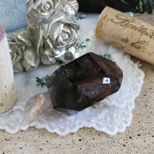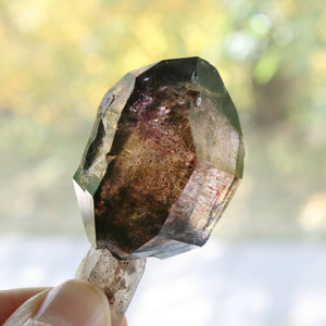 This rather special Scepter is a mix of Clear Quartz, Smoky Quartz and Amethyst. It has inclusions of Lepidachrosite, and Hematite, and to top it off, it has one enhydros! For those not familiar with enhydros, they are water bubbles that have been caught in the quartz since the crystal formed. We have it marked with an arrows. It is small, but as you rock the crystal back and forth, you should see some movement of the bubble. When you look at some of the pictures, you may see little inclusions of red or hair like strands, those are the Hematite and Lepidachrosite. Scepter quartzes are crystals in which a secondary growth grew on top of another quartz crystal. In a classic scepter quartz crystal, the younger crystal is larger than the first crystal, or "stem". Dimensions: 2.29"x1.24"x1.13", 46.2 grams. Location: Lusaka Zambia. Sku: 20F1548.