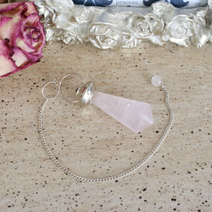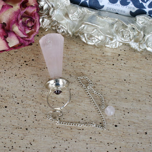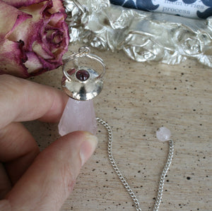 Rose Quartz Pendulum with Garnet Cabochons with Silver Chain with Rose Quartz bead at the end of the chain. If you are not familiar with Pendulums or how to work with them, we sell a wonderful book: https://www.handsofspirit.com/collections/books/products/sku16592