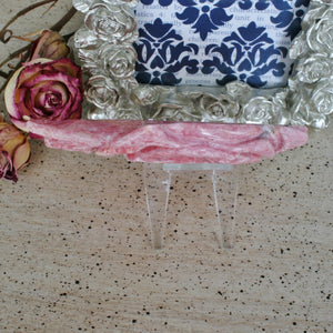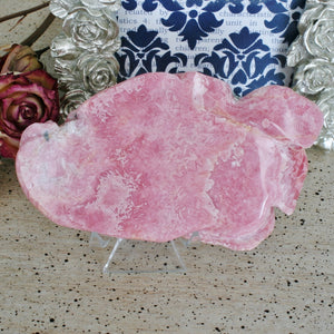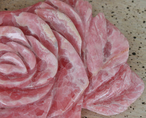 This magnificent beauty is a hand carved Rhodochrosite rose carving. The color of the Rhodochrosite shows best in indoor lighting or warm lighting. This piece is a one of a kind. It can be used to display in your home or an office. For those who love unique carvings, this is a rare one to have in your collection. This carving can also be used in any healing modality. Location: Capilitas, Argentina. Dimensions: 4.45"x2.56"x0.71". Weight: 234.5 grams. SKU: 20J391