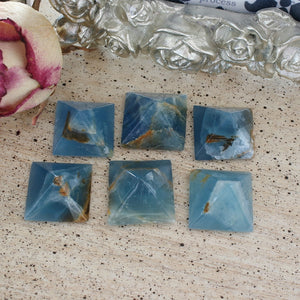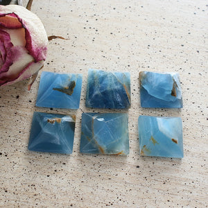 You will receive ONE Blue Calcite Pyramid. When these 6 are held to the light, they illuminate and glow slightly. Please see the first two picture as an example. These can be enjoyed in your home or office, used in grid work or any healing modality.