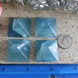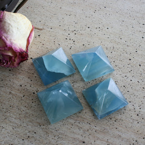 You will receive ONE Blue Calcite Pyramid. These 4 have a stunning blue color. When held to a light, they illuminate and glow slightly as you can see in the last 3 picture. These can be enjoyed in your home or office, used in grid work or any healing modality.
