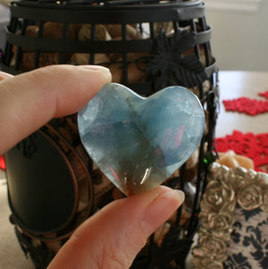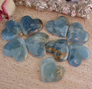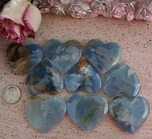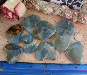 You will receive ONE Blue Calcite heart. As you hold them up to the light, they glow as the light illuminates them. See the last 4 pictures for an example. These are such beautiful gem! They have fantastic polish and can be used to make jewelry or in any healing modality. They can also be carried as a pocket buddy! Location: Argentina. Dimensions: See picture with ruler and dime. Sku: LGH1
