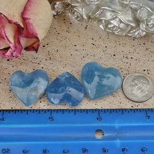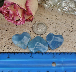 You will receive ONE Blue Calcite heart. All 3 are A grade quality. As you hold them up to the light, they glow as the light illuminates them. See the last 3 pictures for an example. These are such beautiful gems! There is a wide range of qualities in this material, and these are top notch! They have fantastic polish and can be used to make jewelry or in any healing modality. They can also be carried as a pocket buddy! Location: Argentina. Dimensions: See picture with ruler and dime. Sku: SMH5.