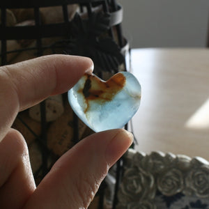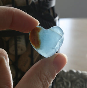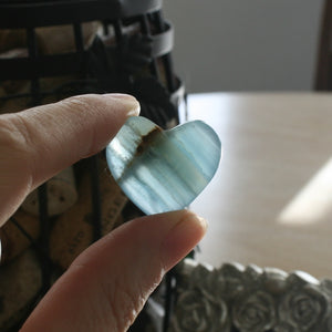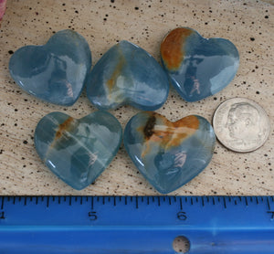 You will receive ONE Blue Calcite heart. As you hold them up to the light, they glow as the light illuminates them. See the last 3 pictures for an example. These are such beautiful gems! They have fantastic polish and can be used to make jewelry or in any healing modality. They can also be carried as a pocket buddy! Location: Argentina. Dimensions: See picture with ruler and dime. Sku: HT1