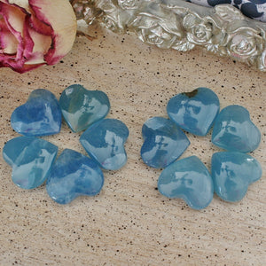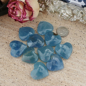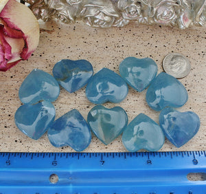 You will receive ONE Blue Calcite heart. All 10 are A grade quality. As you hold them up to the light, they glow as the light illuminates them. See the last 3 pictures for an example. These are such beautiful gems! There is a wide range of qualities in this material, and these are top notch! They have fantastic polish and can be used to make jewelry or in any healing modality. They can also be carried as a pocket buddy! Location: Argentina. Dimensions: See picture with ruler and dime. Sku: SMH2.