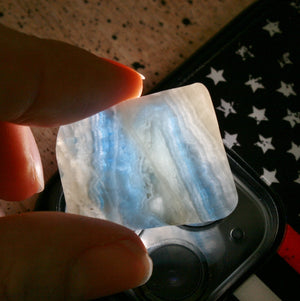 You will receive ONE Scheelite polished rectangle from this lot.  They look like a pieces of art! Some photos where taken in with a light behind the slice to to help show off the stunning glow! This a great for any healing modality as they lay flat on a client. They can also be used in jewelry or just enjoyed for their fun patterns. Location: Turkey. Dimensions: See pictures with ruler. Dimensions: See picture with ruler and dime. SKU: SCH3