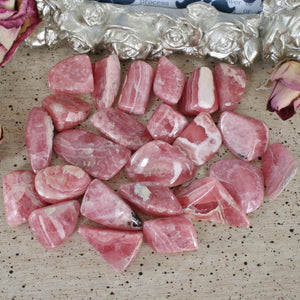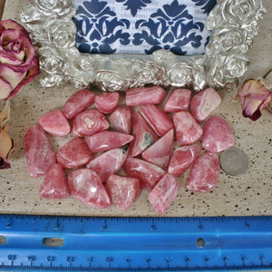 These free form Rhodochrosites are all hand cut and polished from nodules and stalactites. Beautiful quality. Many display banding which create artistic designs. Rhodochrosite's hue changes slightly as the light source changes. It tends to look the most pink in warm indoor lighting. All of the pictures where taken inside with natural daylight only. To see approximate sizes, please see the pictures with a ruler and dime, as well as in the hand. These stones can be used in any healing modality or used as a pocket buddy. They also display beautifully from many angles. Location: 25 de Mayo Vein, Capilitas Mine, Argentina. SKU# RhodoT2